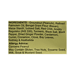 Peanuts (55%), Edible Vegetable Oil, Chick Peas Flour (15%), Corn Starch (2%), Salt, Red Chilli, Acidity Regulator & Antioxidant (E 330), Turmeric, Black Salt, Black Pepper, Dried Ginger Powder, Cardamom, Clove, Bay Leaves & Nutmeg.