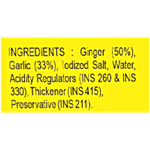 Ginger (50%), Garlic (33%), Iodized Salt, Water, Acidity Regulators (INS 260 & INS 330), Thickener (INS 415), Preservative (INS 211).