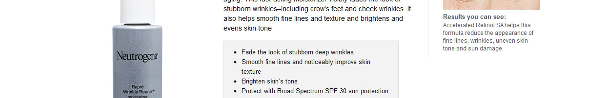 Helps to hydrate and protect your skin. This fast-acting moisturiser visibly fades the look of stubborn wrinkles - including crows feet and cheek wrinkles. It also helps smoothen fine lines and texture and brightens and evens skin tone. In clinical trials, women experienced noticeable results in just one week of use. This super-charged formula is combined with Broad Spectrum SPF 30 for daily sun protection..