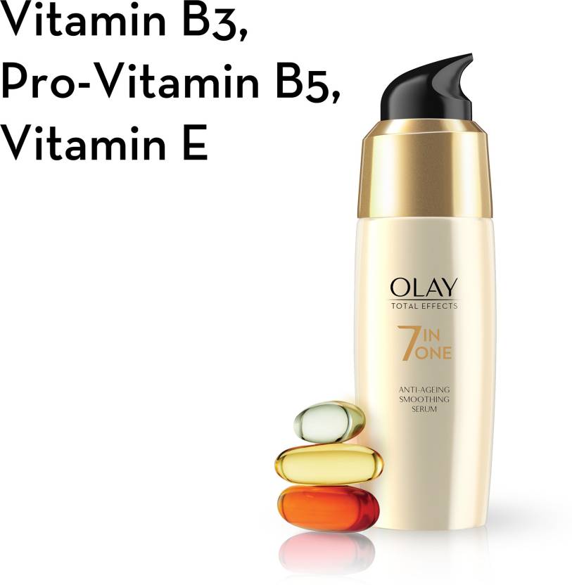 Olay Total Effects with its Vita Niacin complex provides skin with a well-balanced formulation that helps skin to stay looking young and fight the 7 Signs of ageing. Apply morning & evening on clean face & neck before using Olay Total Effects moisturizer. Suitable for Normal to Combination Skin. Total Effects 7-in-1 anti-ageing Serum is fast-absorbing and non-greasy. Helps improve tired-looking skin to give healthy fresh radiance. Targets uneven skin tone and texture with a concentrated anti-aging serum that combines smoothing moisture technology with vitamins and minerals.