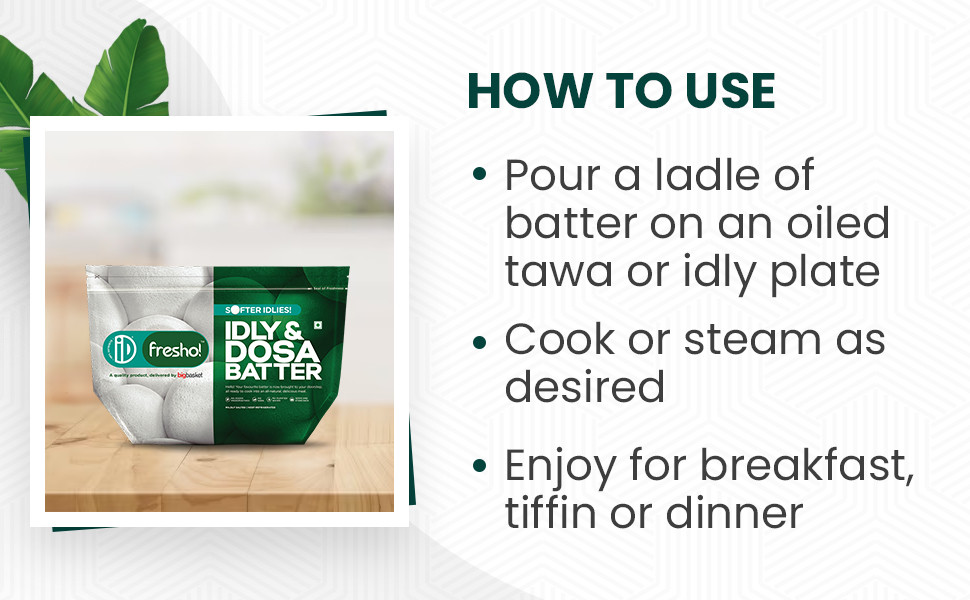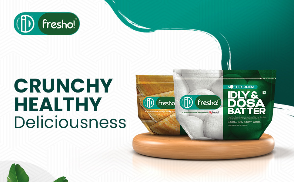 About the ProductThe ID Fresho idli/dosa batter is a ready-made mix that saves your time and energy to create a dosa batter from scratch. Idli and dosa are the most popular healthy south Indian foods. They are made from rice and black lentils. Idlis are made in a specialized mould and eaten with different items like chutney, vegetable stew or other flavorful toppings for breakfast or as a snack. Typically, an idli/dosa batter involves a three-step recipe which includes soaking the rice, grinding, and fermenting it. But with this readymade batter, you can make crispy dosa and fluffy soft idlis at no time at all. This Batter serves to cook 17 to 20 idlis of 12 to 14 dosa. Idlis contain no cholesterol, no fat, and no saturated fat. These small healthy south Indian food treats are good for you and, as a bonus, convenient for those on the go. To make your diet a bit healthier, swap a doughnut or muffin for healthy south Indian food idli/dosa.