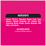 Peanut (66%), Dehusked Bengal Gram Flour (Besan) (22%), Refined Palmolein Oil, Iodised Salt, Seasoning Mixed Powder (Chilli, Dried Mango Powder, Asafoetida, Acidity Regulator (INS330), Coriander, Cassia Leaves, Stone Flower, Triphala, Turmeric & Cloves Sticks) & Corn Starch.