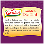 Garden Diet Bhel contains puffed rice, vegetable oil, rice flakes, edible starch and salt. It is available in good quality packaging material so that the taste and aroma of the snacks stay intact.