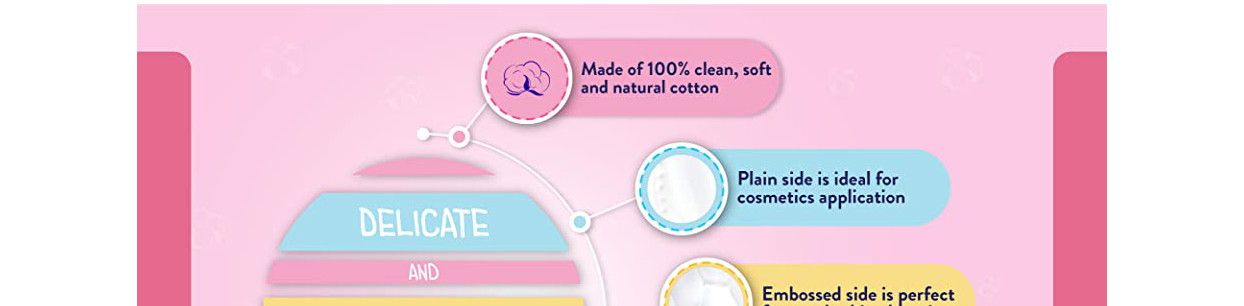 About the product These are soft, gentle and highly absorbent pads that are imported from Europe. The premium quality Bella Cotton Pads are made of clean, soft and natural cotton fibres that are delicate for all skin types. It is a two-sided cotton pad. It has a plain side ideal for cosmetics application and embossed side perfect for gentle skin cleansing. It has closed edges to prevent delamination and fibres separation. It is recommended for cosmetic and hygienic use, ideal for make-up removal. It comes in a handy pack with strings at the top to hang in the bathroom. It has bottom perforation for a convenient dispensing. It is dermatologically tested and a must have in every woman's bag.
