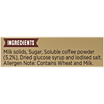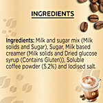 Milk and sugar mix (Milk solids and Sugar), Sugar, Milk-based creamer (Milk solids and Dried glucose syrup (Contains Gluten)), Soluble coffee powder (5.2%), Cocoa solids (1.6%) and Iodised salt.