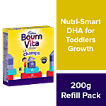 Cadbury bournvita lil champs is a cereal-based Nutrition Drink powder, specially formulated for children of 2-5 years. It contains a nutrient bundle consisting of DHA, iodine, choline, and zinc. DHA is known to aid brain development and bvlc also contains vitamins d, b2, b9, and b12.