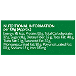 Nutrition per gram/ml: 100g Energy: 142 kcal Protein: 0.8 g Total Carbohydrate: 3.2 g Sugars: 0 g Dietary Fiber: 3.2 g Total Fat: 14.0 g Trans Fat: 0.1 g Saturated Fat: 2.0 g Monounsaturated Fat: 9.0 g Polyunsaturated Fat: 0.8 g Sodium: 1.5 g Iron: 0.5 mg