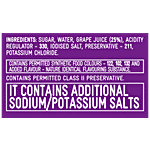 Ingredients:Sugar, Water, Grape Juice (25%), Acidity Regulator - 330, Iodised Salt, Preservative - 211, Potassium Chloride.
