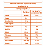Serving Size: 150 ml Energy: 48 kcal Protein: 0 g Carbohydrate: 12 g Total Sugars: 12 g Added Sugars: 0 g Total Fat: 0 g Sodium: 4.3 mg Potassium: 75 mg Calcium: 4 mg Beta-Carotene: 1000 mcg Vitamin C: 6 mg