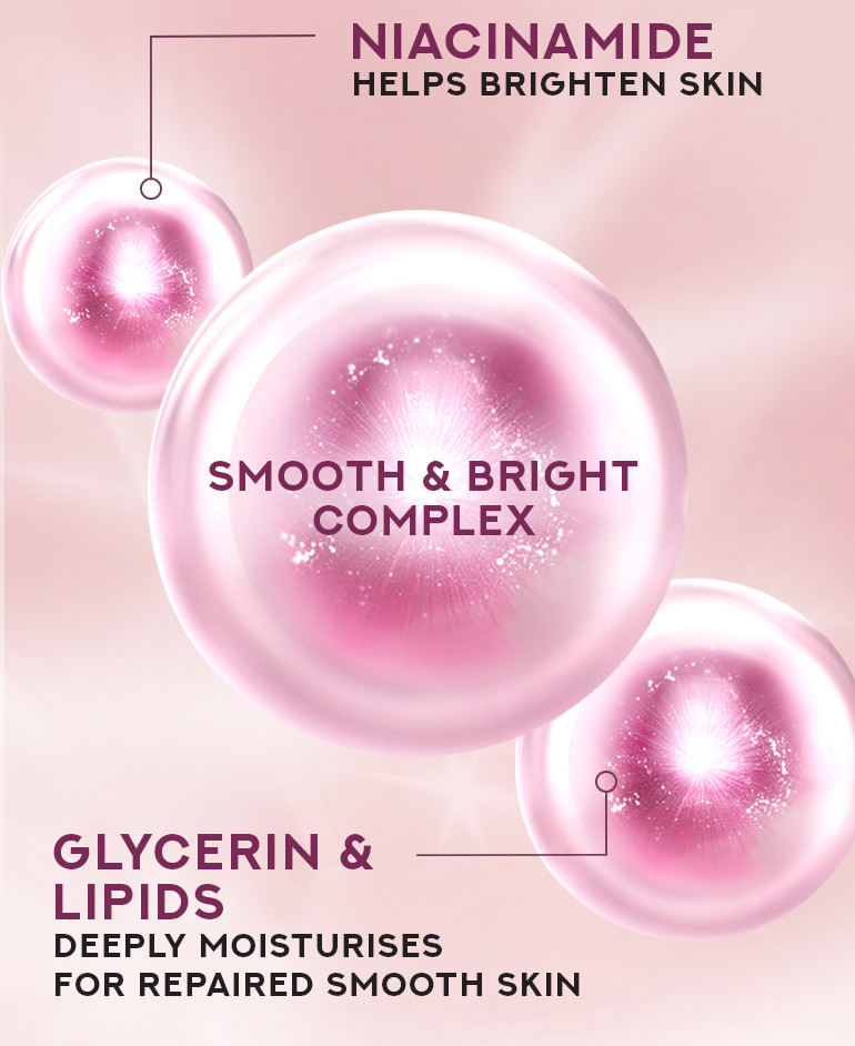 Water, Mineral Oil, Glycerine, Cetearyl Alcohol, Niacinamide, Sodium Cetearyl Sulphate, Dimethicone, Glyceryl Stearate, Paraffin, Fragrance, Microcrystalline Wax, Cellulose Gum, Methylparaben, Disodium Edta, Dmdm Hydantoin, Propylparaben, Tocopheryl Acetate, Benzophenone-3, Bht, Sodium Ascorbyl Phosphate, Simethicone.