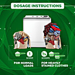 Add 1 cup of scoop for normal water load & 2 cups of scoop for heavily soiled water.