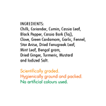 Coriander, Chilli, Cumin, Black Pepper, Cassio, Cardamom, Clove, Salt, Turmeric, Garlic, Fennel Seed, Mint Leaf, Fenugreek, Anistar, Mustard, Dry Ginger, Bengal Gram