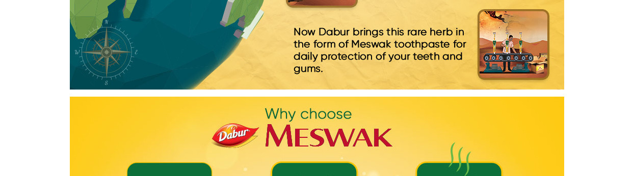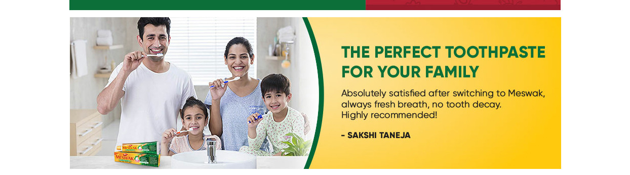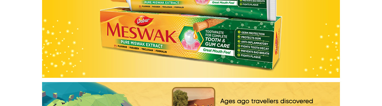 If you want to start your day with something that is truly unique go grab a pack of Dabur Meswak today. Dabur Meswak is made from pure extract of rare Miswak herb which grows slowly, resisting the brutal forces of nature amidst the sand dunes of Africa and South Asia. Even a small portion of this herb is capable of providing Complete Oral Care to you. The ingredients of Miswak herb truly make Dabur Meswak unique. It has Resins that form a layer over the enamel - protecting against caries; Silica which removes stains; Alkaloids exert a bactericidal effect and stimulatory action on gingival, Essential oils stimulate the flow of saliva which works as an antiseptic, Vitamin C helps in healing and repair of tissues, etc. The best part of this unique toothpaste is the amazing mouthfeel it leaves behind, which lasts the whole day. What's more, Dabur Meswak is also non-fluoride toothpaste which makes it different from 80% of the regular toothpaste that is on the market today. Hence it is a smarter option as excess fluoride can lead to dental fluorosis. So, choose well for your family. Choose Dabur Meswak today.