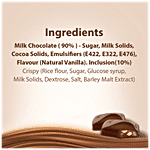 Sugar, Milk Solids, Cocoa Solids, Vegetable Fat (palm Fat Less Than 5%), Emulsifiers (ins 322, Ins 476), Flavour (Natural Vanilla). Inclusion (10%)- Crispy (rice Flour, Sugar, Glucose Syrup, Milk Solids, Dextrose, Salt, Barley Malt Extract.