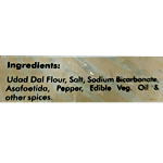 Urad Dal Flour, Salt, Sodium Bicarbonate, Asafoetida, Pepper, Edible Veg. Oil & Other Spices.