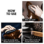 Apply polish with a cloth or polish applicator on clean shoes and buff to a gloss with a brush or soft cloth.
