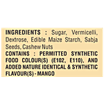 Sugar, Vermicelli, Dextrose, Edible Maize Starch, Sabja Seeds, Cashew Nuts . Contains: Permitted Synthetic Food Colour(S)(E102, E110), And Added Nature Identical & Synthetic Flavour(S) – Mango
