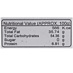 Energy 500KcalTotal Fat 20 gSaturated 12 gTrans Fat 8 gCholesterol 0 gSodium 0.5 gCarbohydrates 58 gFibre 2 gSugar 3 gProtein 8 g