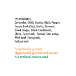Coriander, Chilli, Cumin, Black Pepper, Cassia Bark (Taj), Garlic, Turmeric, Dried Ginger, Black Cardamom, Clove, Curry Leaf, Fennel, Star Anise, Mint Leaf, Fenugreek, Iodised Salt