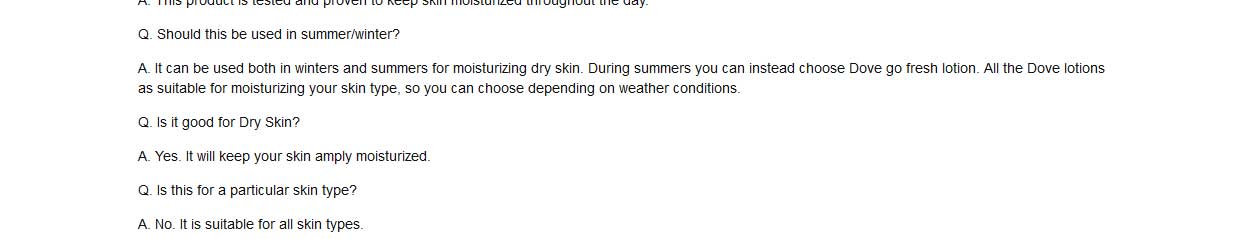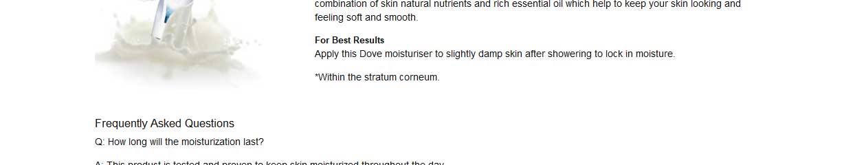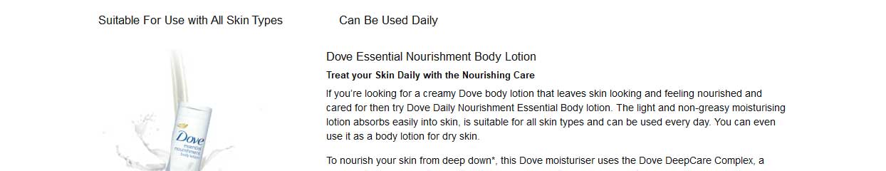The Dove Difference: Made with care. When you have very dry skin, moisturiser is essential – but often you need more intensive nourishment. Ultra-rich and intensely nourishing, Dove Nourishing Body Care, Nourished Radiance Body Cream has been created for all skin types to combat dry skin. The formula deeply nourishes (Within the stratum corneum) your skin and over the period improves skin moisturisation too.