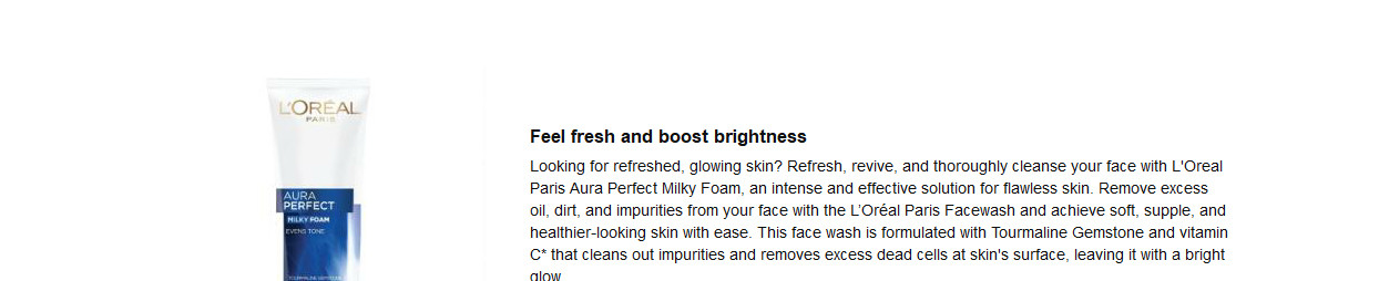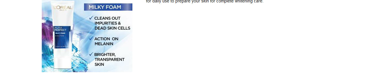 L'Oréal Paris White Perfect Milky Foam is a daily skin cleanser and face wash, enriched with powerful skin brightening benefits that boost the complexion by preparing your skin for complete whitening care. An intense & effective skin cleansing solution created by L'Oréal Skincare Laboratories, for clean and flawless skin. Instantly cleanses & brightens the skin thoroughly, eliminating skin impurities.Tourmaline Gemstone & Vitamin C, to remove excess sebum and dead skin cells and boost skin radiance.