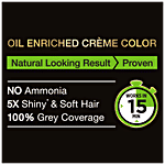 Garnier Black Naturals is enriched with the goodness of Almond Oil and Black Tea extract Enriched with the goodness of Almond Oil and Black Tea Extract. It is a no-ammonia crème formula that works in just 15 minutes. It covers 100% greys and lasts up to 6 weeks.