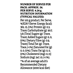 Nutrition per gram/ml: 100g Serving Size: 4.24 g Energy (kcal): 362, 15, (1%) Protein (g): 0.3, Trace Carbohydrate (g): 90.7, 3.8 Total Sugars (g): Trace, Trace Added Sugars (g): 0, 0, (0%) Dietary Fibre (g): 0.9, Trace Total Fat (g): Trace, Trace, (<1%) Saturated Fat (g): 0, 0, (0%) Trans Fat (g): 0, 0, (0%) Cholesterol (mg): 0, 0 Sodium (mg): 247, 10, (<1%)