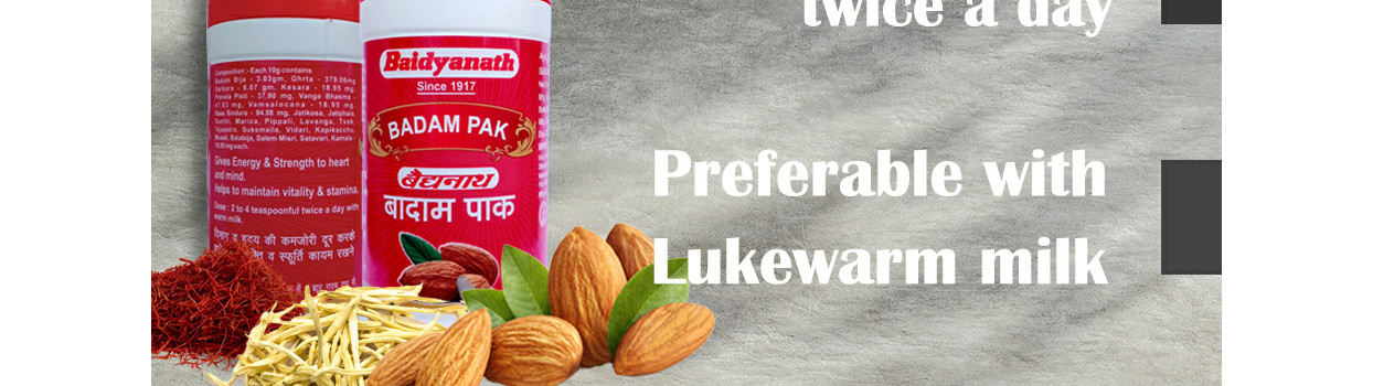 One of Indias most respected Companies, Shree Baidyanath Ayurved Bhawan Pvt. Ltd. (Kolkata), popularly known as Baidyanath, is the acknowledged leader of Ayurvedic know-how. Established in 1917, the Company has played a pioneering role in re-establishing ancient knowledge with modern research and manufacturing techniques. Baidyanath (Nagpur) Badam Pak is a classical ayurvedic preparation in powdered form and made from the best quality almonds. Holistic herbal formula designed to promote the balance of emotions during a time of stress and maintain a healthy body and mind. Only the best quality and authenticated almonds are used in the formulation for more efficacies.
