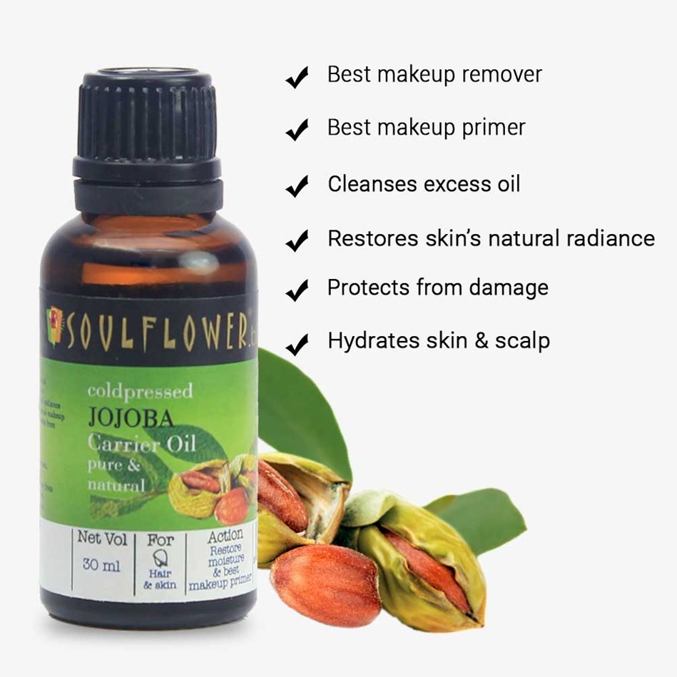 100% pure, natural, vegan and cold-pressed Soulflower Jojoba Carrier Oil restores skin's natural radiance by hydrating and cleansing excess oil is considered to be one of the most effective and preferred make-up removers and primers due to its instant cleansing property.