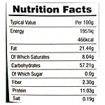 Nutrition per gram/ml: 100g Energy: 1951kj 466kcal Fat: 21.44g Of Which Saturates: 8.04g Carbohydrates: 57.21g Of Which Sugar: 0.0g Fiber: 2.30g Protein: 11.03g Salt: 0.19g