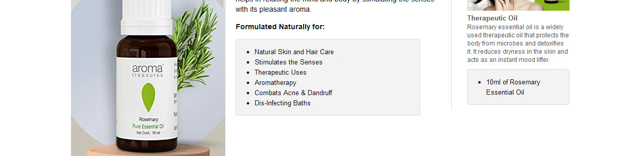 Rosemary essential oil is an excellent brain and nerve tonic. It is often used by students during exam times because it increases concentration and helps in studying efficiently. It stimulates mental activity and is a good remedy for depression, mental fatigue, and forgetfulness. Inhaling rosemary oil seems to lift your spirits immediately. Whenever your brain is tired, try inhaling a little rosemary oil to remove boredom and renew your mental energy. The oil is also used in room fresheners, cosmetics, beauty aids, food, bath oil, candles, and perfumes because of its unique and intoxicating aroma.