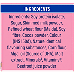Soy Protein Isolate, Sugar, Skimmed Milk Powder, Refined Wheat Flour (Maida), Soy Fibre, Cocoa Powder, Colour (INS 150d), Nature Identical Flavouring Substances, Corn Flour, Algal Oil (Source Of DHA), Malt Extract, Minerals, Vitamins, Beetroot Juice Powder