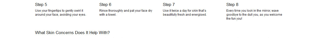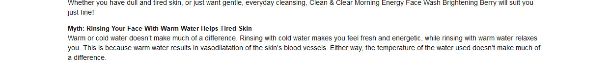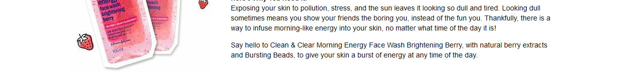 Clean & Clear Morning Energy Berry Face Wash is specially formulated with menthol, soft bursting beads and a refreshing fragrance. The special ingredients create a cool, tingling sensation on your skin that truly wakes you up and makes you feel energised, while thoroughly cleansing your skin and leaving it clean & clear