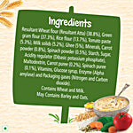 Ingredients: Resultant wheat flour (Atta), Green gram flour, Rice flour, Tomato paste, Milk solids, Ghee, Minerals, Carrot powder, Spinach powder, Starch, Sugar, Acidity regulator (Dibasic potassium phosphate), Maltodextrin, Carrot puree, Spinach puree, Vitamins, Glucose syrup, Enzyme (Alpha amylase), Packaging gases (Nitrogen and Carbon dioxide).