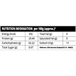 Nutrition per gram/ml: 100g Energy (Kcal): 356 Total Fat (g): 0 Protein (g): 24.44 Saturated Fat (g): 0 Carbohydrates (g): 62.22 Sodium (mg): 11 Total Sugar (g): 6.67