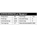 Nutrition per gram/ml: 100g Energy (Kcal): 343 Total Fat (g): 1.43 Protein (g): 22.86 Saturated Fat (g): 0 Carbohydrates (g): 62.86 Sodium (mg): 0 Total Sugar (g): 5.71