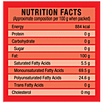 (per 100 gm) Calories: 884 kcal Total fat: 100 g Cholestrol: 0 mg Sodium: 0 mg Saturated fat: 12 g Polyunsaturated fat: 21 g Monounsaturated fat: 59 g. Total carbohydrate: 0 g Protein: 0 g.