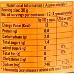 Nutrition per gram/ml: 100g Serving Size: 30 g Energy Value (Kcal): 13 Protein (g): 0.6 Carbohydrate (g): 2.8 Total sugars (g): 1.4 added sugars (g): 0 Total Fat (g): 0 Cholesterol (mg): 0 Sodium (mg): 746