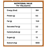 Nutrition_per: 100g Energy (kcal): 364 kcal Protein (g): 9.5 g Fat (g): 19.8 g Saturated Fat (g): 3.2 g Carbohydrate (g): 37 g Sugars (g): 13 g Sodium (mg): 6000 mg