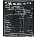 Nutrition per gram/ml: 100g Serving Size: 1 Tbsp (15g) Energy: 115 kJ (27 kcal) Protein: 0.8g Total Fat: 0.7g Saturated: 0.2g Carbohydrate: 2.2g Sugars: 2.2g Sodium: 3370mg