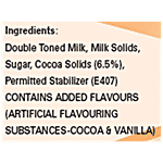 Double Toned Flavoured Milk, Sugar & Cocoa Solids, Contain Permitted Stabilizer (E407) & Artificial Flavouring Substance.