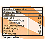 Nutrition per gram/ml: 100g Energy, kcal: 109 Total Fat, g: 2.9 Saturated Fat, g: 1.9 Trans Fat, g: 0.1 Total Carbohydrate, g: 17 Added sugar, g: 8 Protein, g: 3.8 Calcium, mg: 160