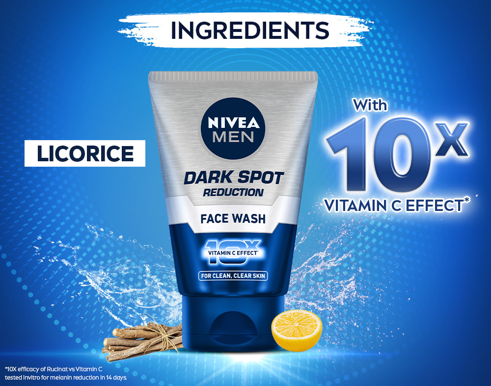 Nivea Men Dark Spot Reduction Face Wash effectively reduces dark spots accumulated from dirt and residues. It removes impurities and excess oil, providing deep cleansing for whiter skin. With oil control lasting up to 12 hours, it leaves skin looking healthy and feeling fresh. The enhanced 10x* formula with Whitanat Vita Complex Plus, containing 10 nutrients including licorice, Vitamin C, and Vitamin E, suits all skin types.