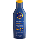 "NIVEA SUN Protect & Moisture Moisturising Sun Lotion offers reliable UVA/UVB protection alongside intensive, long-lasting moisturisation for skin that feels soft and hydrated.