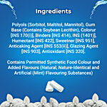 Polyols (Sorbitol, Maltitol, Mannitol), Gum Base (Contains Soybean Lecithin), Colour [INS 17(i)], Binders [INS 414), INS (141)], Humectant [INS 422], Sweetener [INS 951], Anticaking Agent [INS 553(ii)], Glazing Agent [INS 93], Antioxidant [INS 320], Permitted Synthetic Food Colour and Added Flavours (Natural, Nature-Identical and Artificial (Mint) Flavouring Substances)