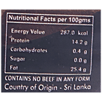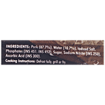 Pork (80%), Water (17%), Iodized salt, Phosphates (E450, E451, E452), Sugar, Anti oxidant (E300), Curing Salt (E250), NutritionPer 100g, Energy Value 320.0 Kcal, Protein 17.0g, Fat 28.0g, Saturated Fats 12.0g, Monounsaturated Fatty Acids 13.5g, Polyunsaturated Fatty Acids 2.0g,Trans Fatty Acids 0.0g, Carbohydrates 0.0g, Cholesterol 0.059g, Vitamin A 0.0mg, Vitamin C 0.0mg, Sodium 100g, Calcium 0.0mg.