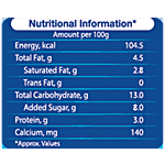 Nutrition per gram/ml: 100g Energy, kcal: 104.5 Total Fat, g: 4.5 Saturated Fat, g: 2.8 Trans Fat, g: 0 Total Carbohydrate, g: 13.0 Added Sugar, g: 8.0 Protein, g: 3.0 Calcium, mg: 140