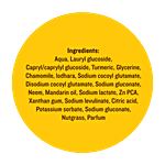 Aqua, Lauryl Glucoside, Capryl/caprylyl Glucoside, Curcuma Longa (turmeric) Extract*, Glycerine, Matricaria Recutita (chamomile) Infusion, Symplocos Racemosa (lodhara) Infusion*, Sodium Cocoyl Glutamate, Disodium Cocoyl Glutamate, Sodium Gluconate, Azadirachta Indica (neem) Infusion*, Citrus Heticulata (mandarin Oil), Sodium Lactate, Zn PCA, Xanthan Gum, Sodium Levulinate, Citric Acid, Potassium Sorbate, Sodium Gluconate, Cyperus Rotundus (nagarmotha) Extract*, Parfum**, Linalool**, Geraniol**, Citronellol**, Limonene**, Benzyl Alcohol**, Benzyl Benzoate**, Benzyl Salicylate**, Citral**, Farnesol**, Eugenol**, Isoeugenol** *from Certified Organic Farms **from Essential Oils.