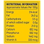 Approximate Values Per 100g, Energy 308 kcal, Protein 21.0g, Carbohydrate 2.0g, Of which Sugar 0.0g, Fat 24.0g, Calcium 652mg, Phosphorus 662mg, Sodium 1442mg, Vitamin A 330mcg.