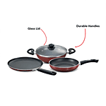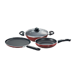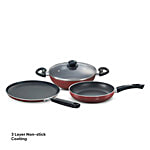 Omega Deluxe Kitchen - 3 pcs Set - 3 layered non-stick cookware, Omega Deluxe Cookware presents, a range of contemporary cookware that complements today's busy lifestyle and helps you serve tasty and healthy food. This beautiful cookware range also has advanced features like induction base and glass lid, enabling you to cook and serve in the same.